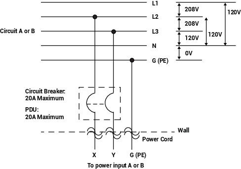 Figure 58 shows a three-phase 208V AC, Y-, or Δ-source circuit connection, which is a phase-to-phase source connection. Note that the X and Y inputs on the ztC Endurance system can be connected from L1 and L2, L2 and L3, or L1 and L3. This application requires a double-pole circuit breaker.