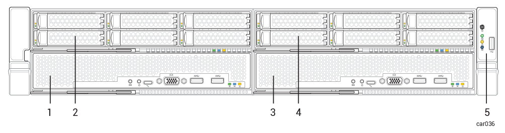 The front of the system consists of two storage modules and two compute modules. Each storage module and each compute module is a CRU module. The system front also includes the control-panel ear on the right and a blank ear on the left. See Figure 1.