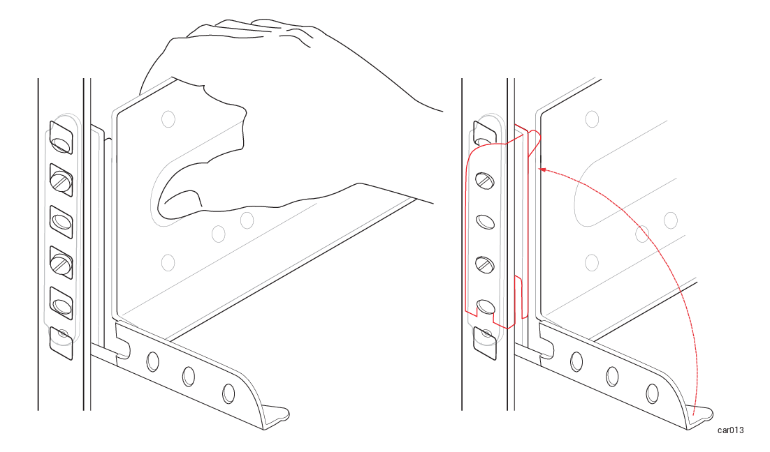 2. Align the silver alignment screws in the front of the left support rail with the 2U holes that you marked in Numbering the Vertical Rails (that is, the third hole of the first U and the second hole of the second U). Close the latch. See Figure 18.